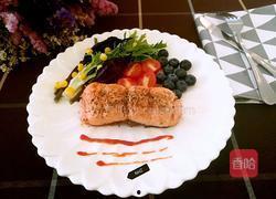 4. 出锅装盘:煎好的三文鱼用厨房纸巾吸去多余的油分,然后装盘。